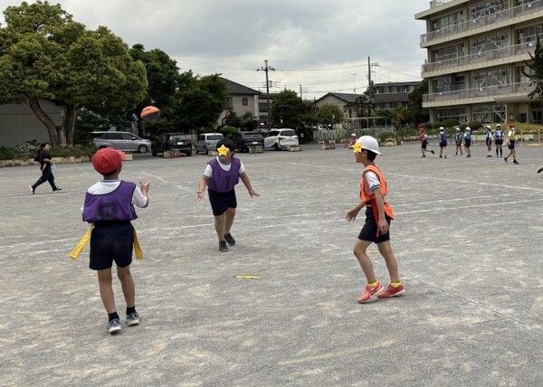 5年生はタグラグビーです。腰につけた尻尾のような布を取られたら動きが止まります。