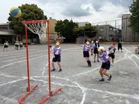 4年の「ハーフバスケットボール」(というそうです)は、守りが半分の人数で行っていました。かご型のゴールを使ってこちらに入れるのですが、ドリブルはできない決まりです。パスだけでまわしていくのですが、とても楽しそうでした。