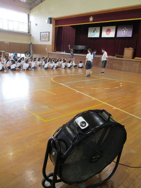 暑さ指数が基準値を越えたため校庭での練習はできません。体育館は基準値を下回っていましたので、適宜休憩、水分補給をとりながら、大型扇風機を活用しながらでの練習が始まりました。