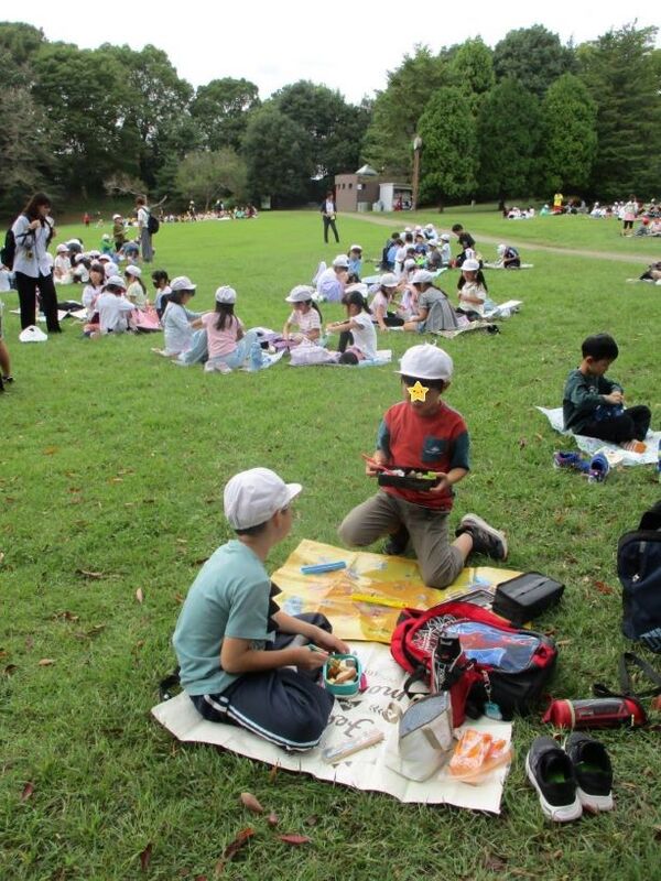 お昼は外の芝生広場でお弁当です。おやつもとても楽しそうでした。私の所にも何人もおやつのおすそ分けに来てくれました。