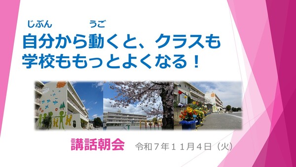 今朝の朝会のテーマは「自分から動くと、クラスも学校ももっとよくなる」です。今求められている「エージェンシー」についてでもあります。