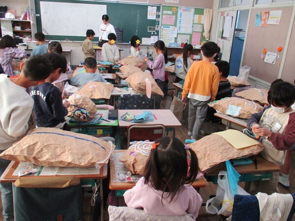 2年生が図工で「ぎゅっとしたい! わたしのお友だち」という作品を作っていました。抱きしめると気持ちがいいように、中には新聞紙が入っているそうです。お友達になりたい自由なキャラクターを思い思いに作っていました。