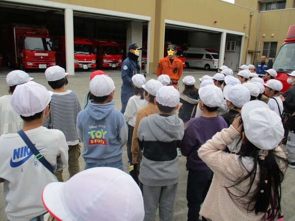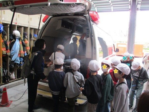 消防署の方が、本校を2つのグループに分け、救急車や消防車などの特殊車両を、時折、冗談を交えながら、丁寧に教えて頂きました。