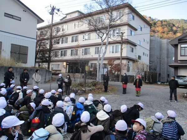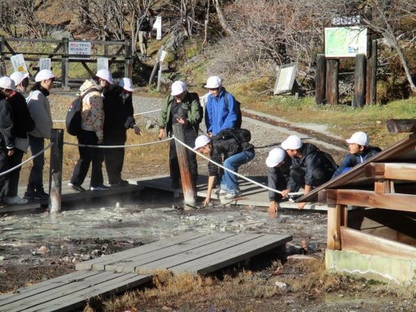 源泉では周囲は温泉のにおいが立ち込めており、水たまりを触ると温かいです。ぷくぷくと湧きあがってくる温泉を体感しました。徒歩でホテルに移動し、入館式を済ませ、各部屋に分かれます。夕食、入浴(温泉)、買い物と楽しい思い出がたくさんできたようです。