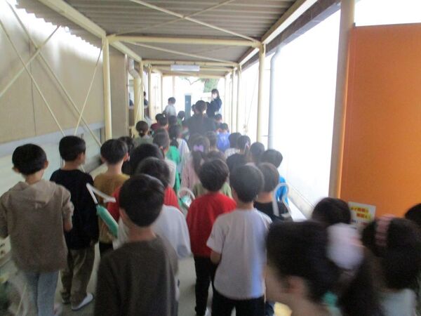 保護者の皆様の入場が落ち着いた頃、いよいよ、子どもたちの出番です。移動が始まります。体育館前を通るとき、いつもと様子が違っていました。ドキドキしているんだろうな、という顔をしている子がたくさんいます。