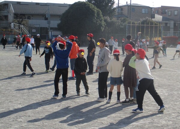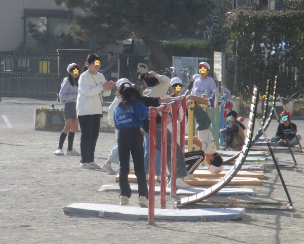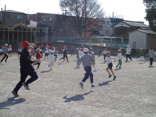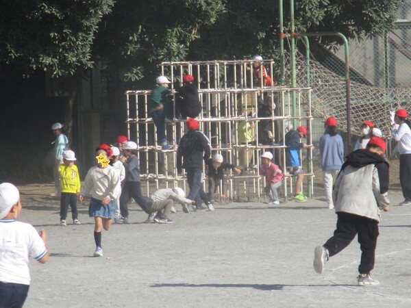 先生方も校庭に出て遊んでいました。子どもたちと先生がこのように外で元気に遊んでいる姿は、心を和ませてくれます。