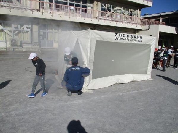 最後に5年生は煙体験をしました。煙の中は何も見えなくなります。 万が一に備えての貴重な体験をしました。