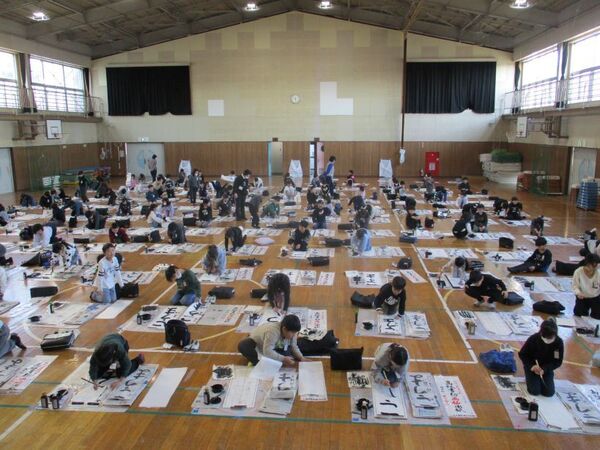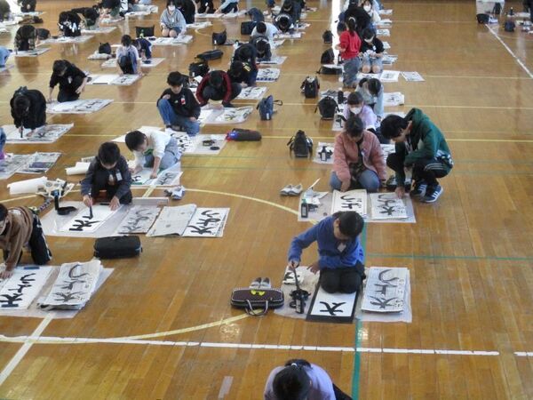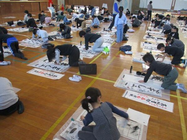 毛筆を使う3,4年生は体育館で行いました。(1,2年生は教室です)