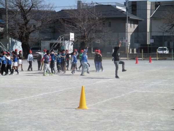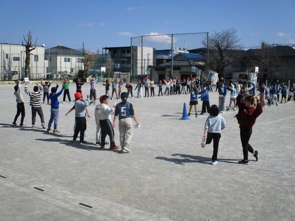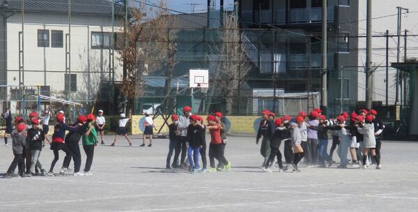 ジャンケンに勝つたびに列がどんどん長くなり、最後には学年全体がひとつにつながっていきます。