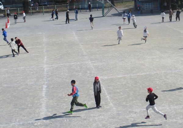 校庭では、おそらく鬼ごっこに夢中の様子。みんなが全力で走り回っていて、とにかく楽しそう!
